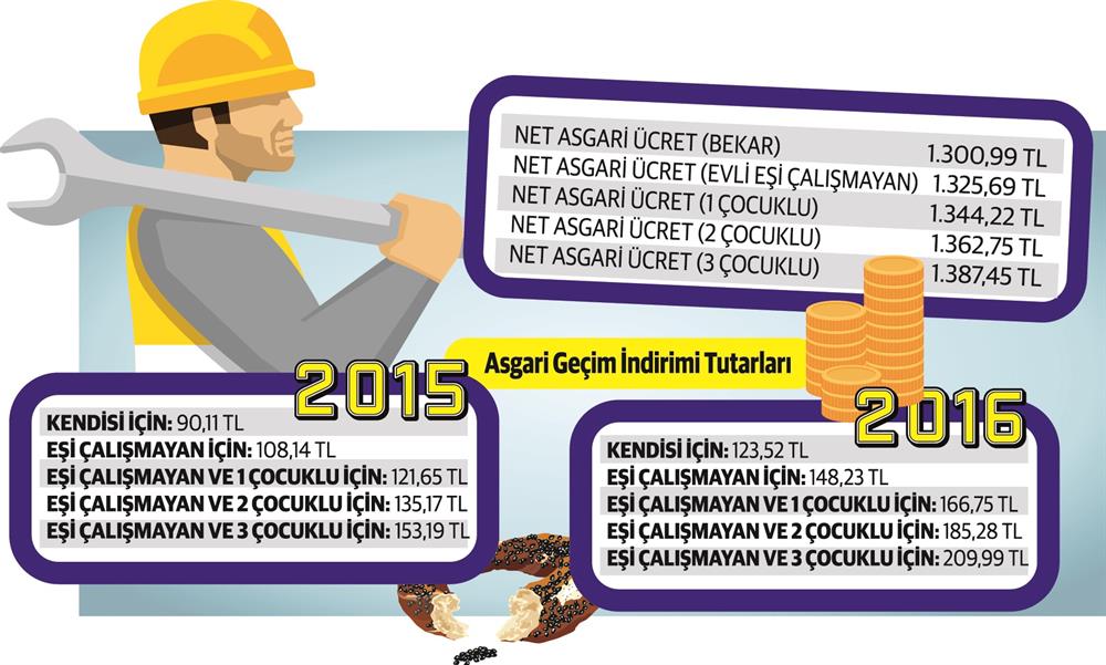 Sektör uzmanları, 1.300 liranın üzerinde ek AGİ desteği alabilmek için ise ancak asgari ücretle çalışan işçinin evli veya çocuklu olması koşulunun gerçekleşmesi gerektiğini belirtiyor. Bu durum oluştuğu takdirde asgari ücretlinin ek olarak alacağı devlet desteği ödemesi kademeli olarak yükseliyor. Asgari ücrete ilişkin genel uygulama altı aylık dönemler için geçerli olacak ücretlerin ayrı ayrı belirlenmesi şeklindeydi. Ancak, Asgari Ücret Tespit Komisyonunca 2016 yılı için belirlenen asgari ücret, önceki yıllardan farklı olarak, 2016 yılının tamamı için geçerli olacak. Dolayısıyla, belirlenen asgari ücretin yılın ikinci yarısında artırılması gibi bir durum da gerçekleşmeyecek.