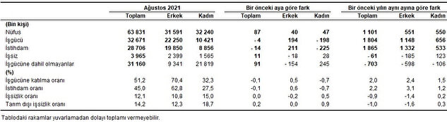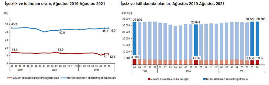 Türkiye genelinde 15 ve daha yukarı yaştaki kişilerde işsiz sayısı 2021 yılı Ağustos ayında bir önceki aya göre 11 bin kişi artarak 3 milyon 965 bin kişi oldu. İşsizlik oranı ise değişim göstermeyerek %12,1 seviyesinde gerçekleşti.