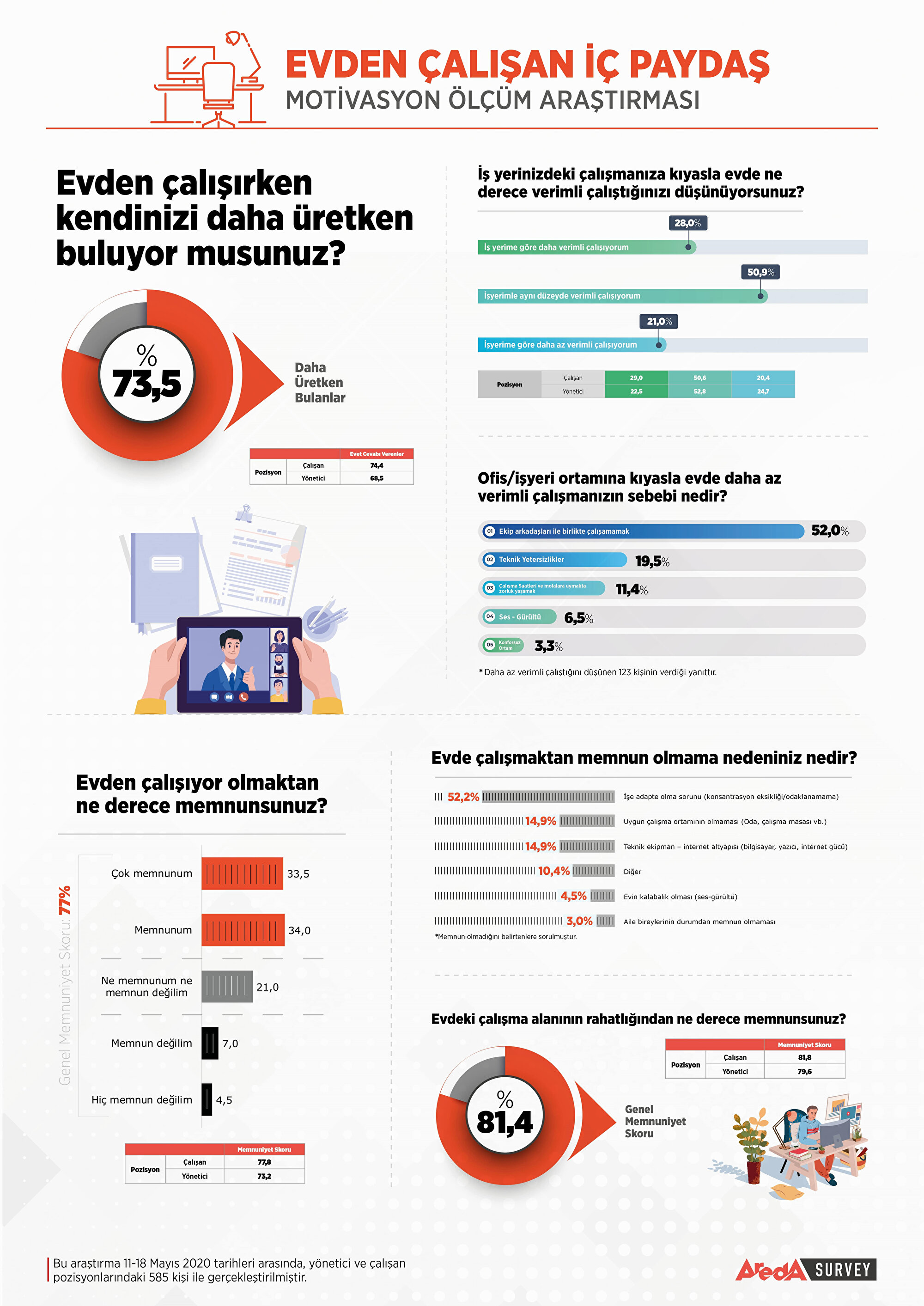 - Araştırma, evde çalışmayı değerlendiren yönetici pozisyonundaki kişilerin yüzde 78'inin çalışanların evde çalışma performansından memnun olduğunu ortaya koydu.