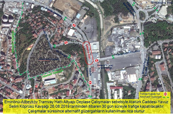 Eminönü-Alibeyköy Tramvayı için altyapı deplasesi (taşıma) yapılacak. Çalışma sebebiyle Atatürk Caddesi-Yavuz Selim Köprüsü Kavşağı 26.08.2019 tarihinden itibaren 30 gün süreyle trafiğe kapatılacak. Trafik alternatif güzergahlardan aksamadan işleyecek.