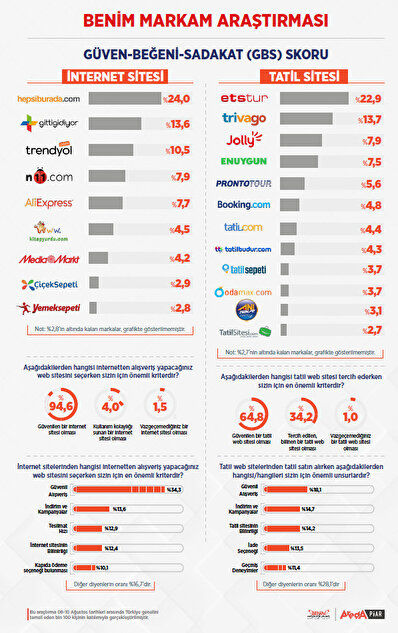 Araştırmaya göre en çok tercih edilen Hepsiburada.com’u, yüzde 13,6 ile Gittigidiyor, yüzde 10,5 ile Trendyol, yüzde 7,9 ile n11 takip etti. Listede yer alan diğer internet siteleri şöyle şekillendi: “AliExspress yüzde 7,7, kitapyurdu.com yüzde 4,5, media markt yüzde 4,2, çiçek sepeti yüzde 2,9, yemek sepeti yüzde 2,8”. Araştırmada güven-beğeni-sadakat skoru sıralamalasında yüzde 22,9 ile başı çeken etstur’u, yüzde 13,7 ile trivago, yüzde 7,9 ile jolly ve yüzde 7,5 ile enuygun.com takip etti. Listede yer alan diğer siteler şöyle: “Prontotour yüzde 5,6, booking.com yüzde 4,8, tatil.com yüzde 4,4, tatilbudur.com yüzde 4,3, tatilsepeti yüzde 3,7, odamax yüzde 3,7, anitur.com yüzde 3,1, tatilsitesi.com yüzde 2,7”