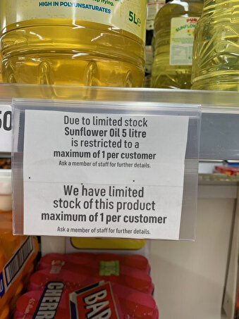 İngiltere'deki tedarik zincirinin Ukrayna savaşından olumsuz etkilenmesi nedeniyle, İngiltere'deki bazı süpermarketler her müşterinin alabileceği yemeklik yağ için sınırlamalar belirledi.