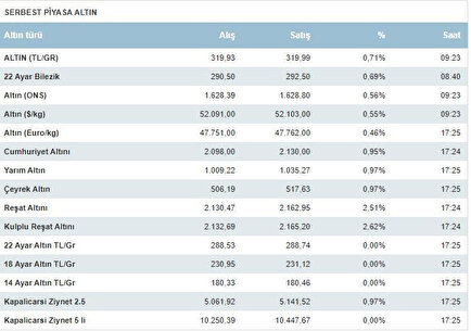 - Cumhuriyet Ata Lira 2 bin 130 liradan, 22 Ayar Bilezik (Gr.) 292 liradan, Yarım Ziynet bin 35 liradan ve Çeyrek Ziynet 517 liradan satılıyor.