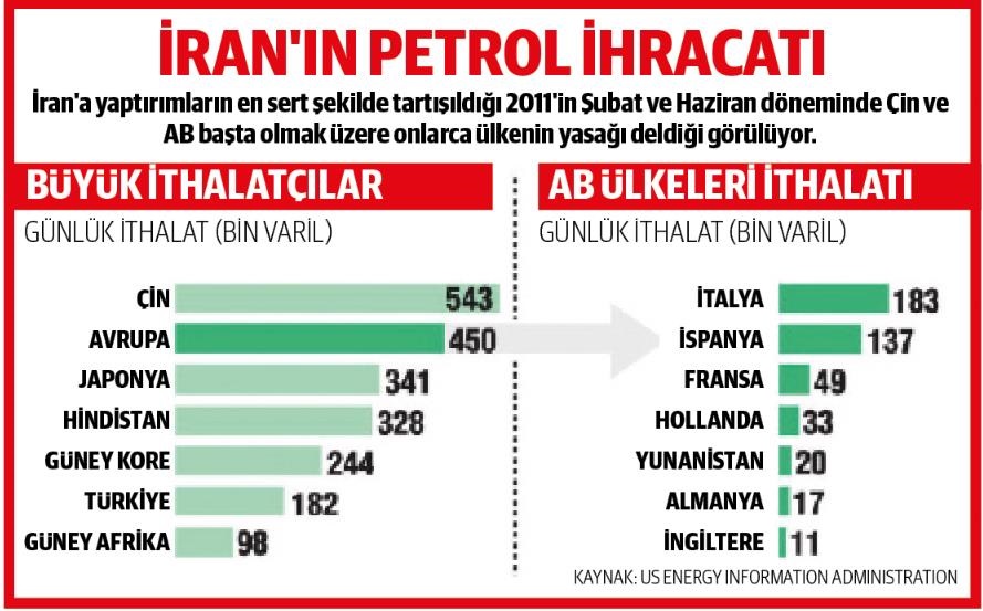 US Energy Information Administration’un Türkiye’ye yönelik iddiaları kapsayan Şubat- Haziran 2011 raporuna göre, AB ülkeleri İran’dan günde 450 bin varil petrol ithal etti. Çin 543 bin varil petrol ile ilk sırada yer aldı. Japonya 341 bin, Hindistan 328 bin, Güney Kore 244 bin ve Türkiye 183 bin varil petrol ithal etmiş.
