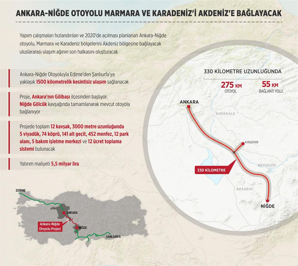 Yapım çalışmaları hızlandırılan ve 2020'de açılması planlanan Ankara-Niğde Otoyolu ile Marmara, Karadeniz ve Akdeniz bölgelerini birbirine bağlayan, uluslararası öneme sahip ulaşım ağı oluşturulacak.