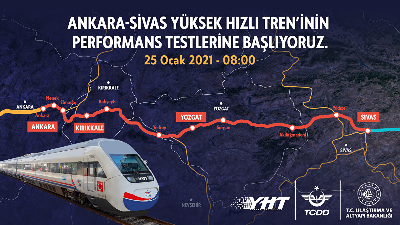 Ankara-Sivas Yüksek Hızlı Tren (YHT) hattının performans testleri başladı. Ankara'dan sabah 8'de hareket eden trenin Sivas'a test çalışmalarını yaparak ulaşması planlanıyor. Testlerin başarıyla tamamlanmasının ardından Ankara-Sivas YHT hattının açılışı yapılarak, hat işletmeye alınacak.