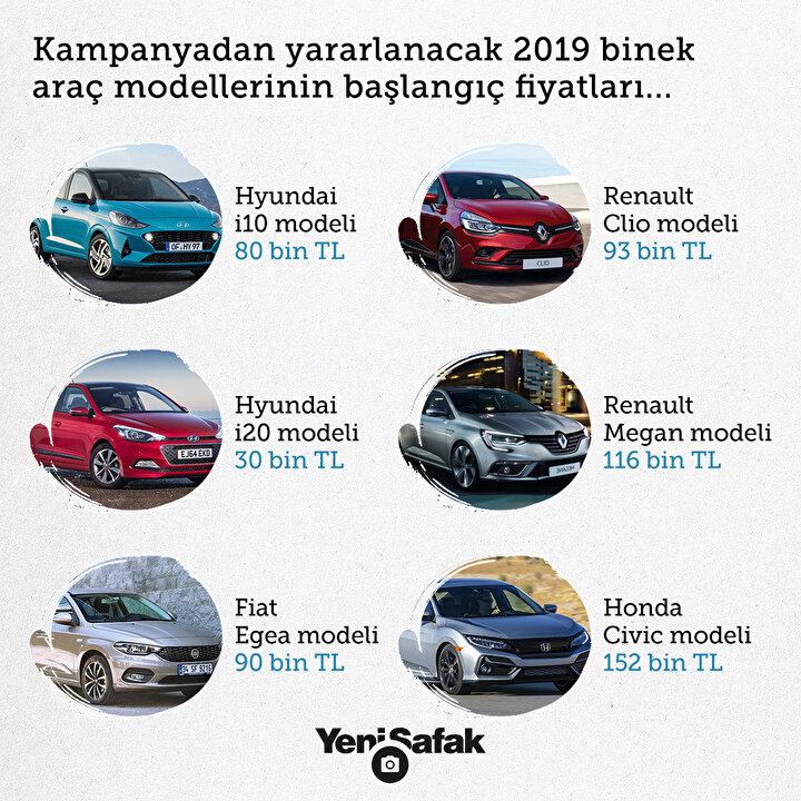 Yine aynı markanın kampanyadan yararlanacak olan bir diğer modeli olan i20'nin anahtar teslim fiyatı en düşük donanımda 103 bin TL olarak ifade ediliyor. Kampanya kapsamında yararlanacak diğer modellerden, Fiat'ın Egea modelinin liste satış fiyatı 90 bin TL'den başlarken, Honda'nın Civic modeli 152 bin TL, Renault Clio 93 bin TL, Megan ise 116 bin TL olarak satışa sunuluyor.