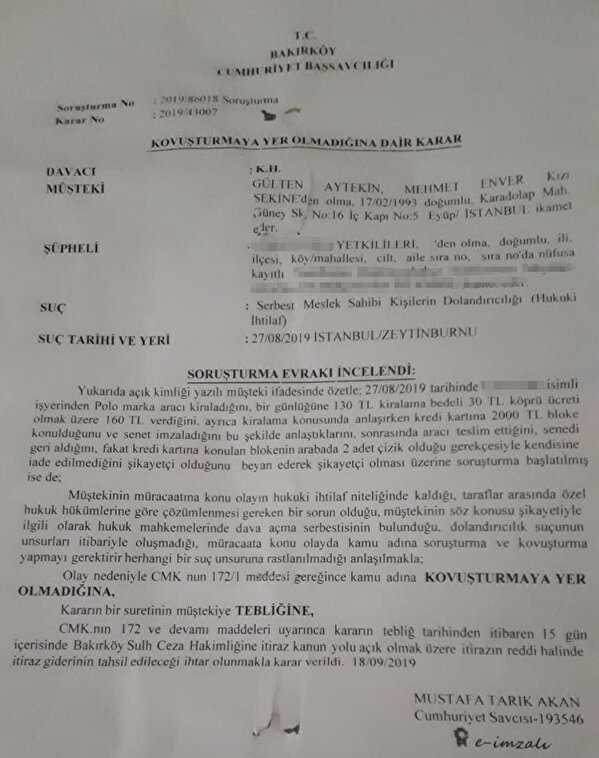 ''Araç kiralamam gerekiyordu. İnternet üzerinden adrese teslim uygun fiyatlı araç yazdığımda en üst sırada bu firmanın reklamını gördüm. Orada yazan numara üzerinden kendilerine ulaştım. Piyasada 200 TL olan bir aracı 130 TL'ye kiraladım. Bana açık senetli sözleşme imzalatıp, 2500 TL de depozito kartımdan çektiler. Aracı teslim ettikten sonra depozitoyu tarafıma araçta çizik var gibi çeşitli bahaneler ile ödemediler.”