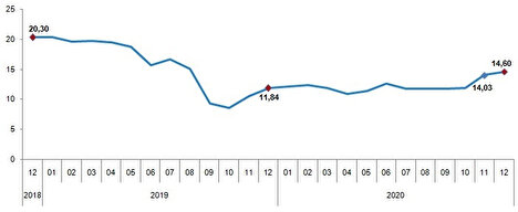 TÜFE'de 2020 yılı Aralık ayında bir önceki aya göre %1,25, bir önceki yılın Aralık ayına göre %14,60, bir önceki yılın aynı ayına göre %14,60 ve on iki aylık ortalamalara göre %12,28 artış gerçekleşti.
