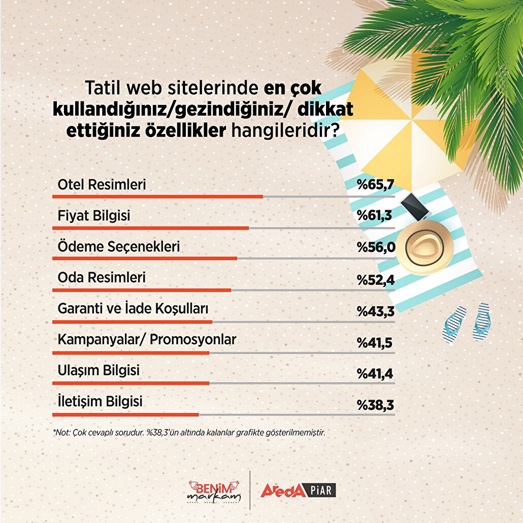 - "Farklı tatil alternatiflerini bir arada bulundurması yüzde 47,9, geçmiş deneyimler yüzde 47, tatil sitesinin bilinirliği/popülerliği yüzde 37,7, öneri/tavsiye yüzde 35,3, tatil yerinde ödeme seçeneği bulunması yüzde 32,8, İade seçeneği yüzde 32,5, paket tatil seçeneklerinin olması yüzde 28,9, bağlantının güvenli olması yüzde 24.4, reklam/tanıtım yüzde 3,8."