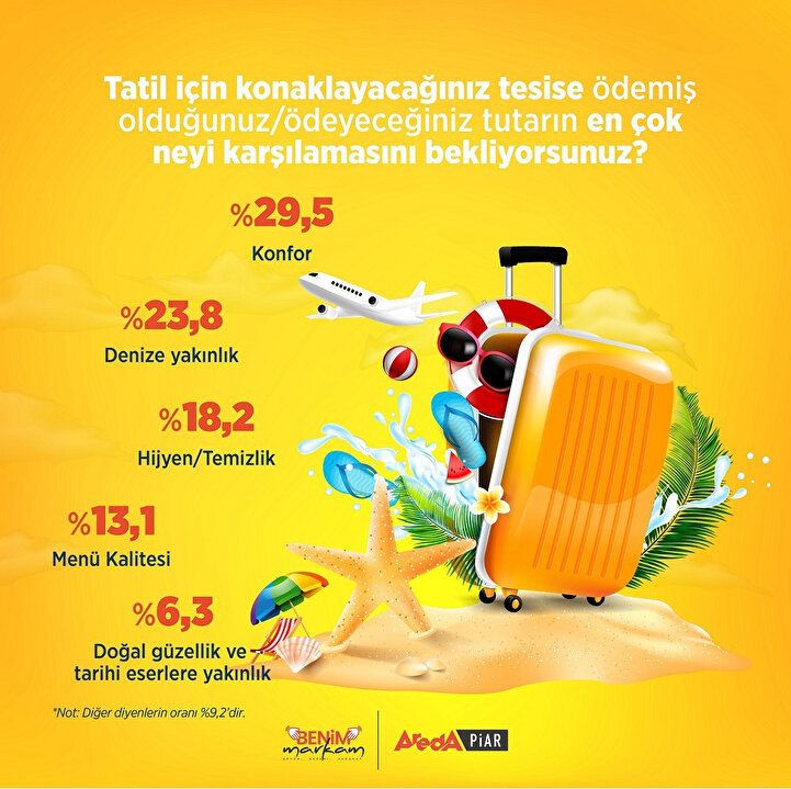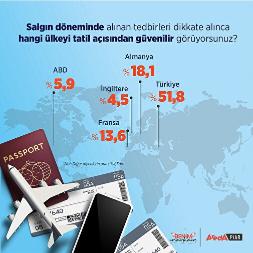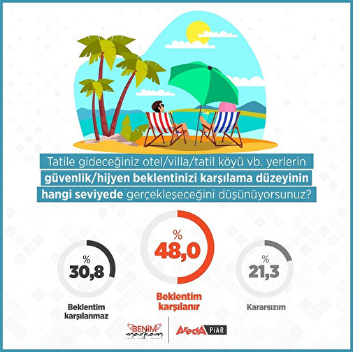 Tatil planlarında internet sitelerine yönelimi inceleyen Areda Piar'ın 28-31 Mayıs tarihleri arasındaki Benim Markam araştırmasına göre, kullanıcıların yüzde 46,7’si bir tatil sitesi tercih ederken en önemli unsurun güven olduğunu belirtirken, yüzde 65,7’si ise kalacağı oteli fotoğraflarına bakarak tercih ediyor. Bin 100 kişinin katıldığı araştırmaya göre, tatil yapacak vatandaşların yüzde 53,8’i salgın tedbirleri açısından Türkiye’yi güvenli bulduğunu ifade ediyor.