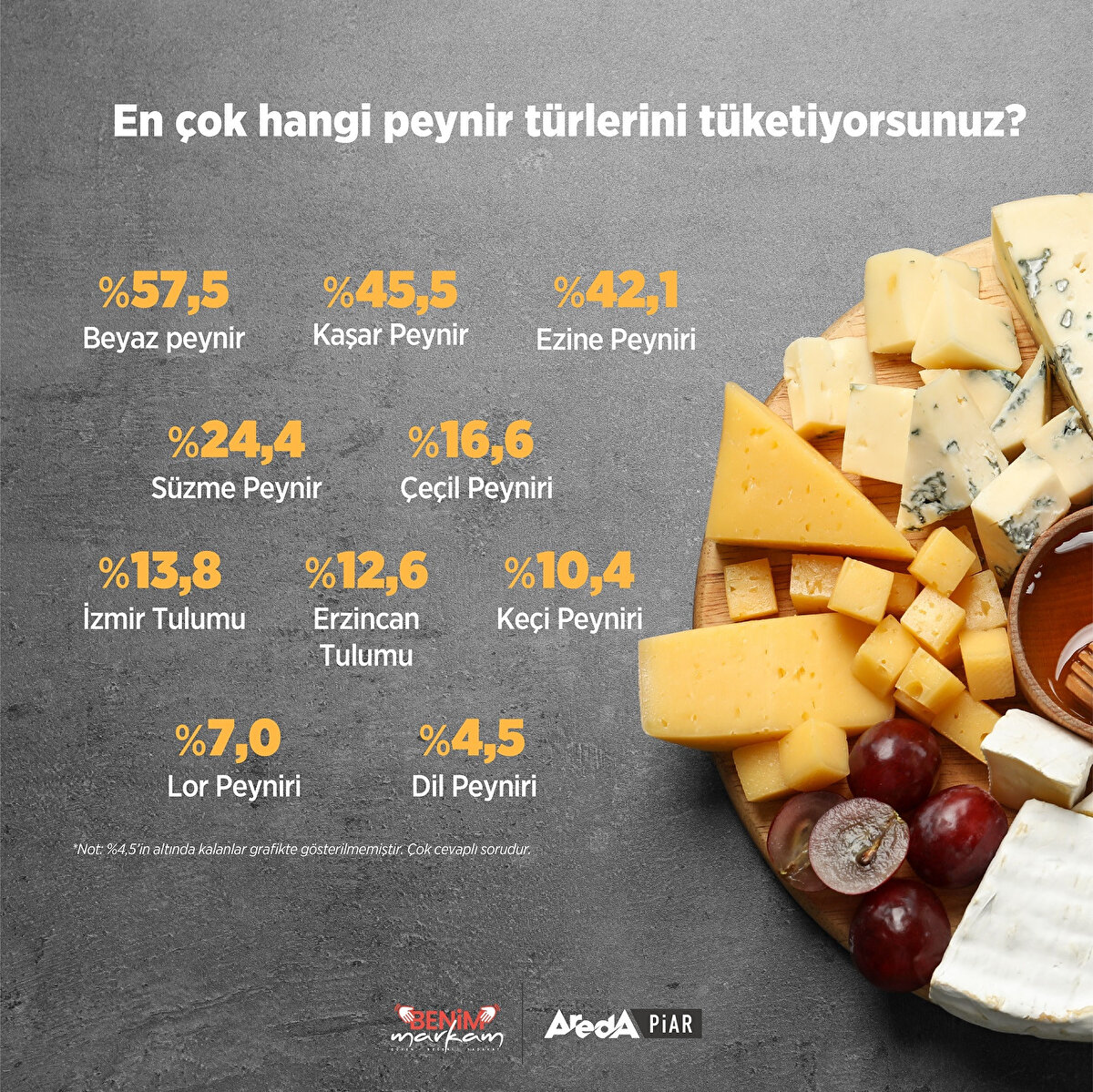 Araştırmada yer alan ‘En çok hangi peynir türlerini tüketiyorsunuz’ sorusuna katılımcıların yüzde 57.5'i beyaz peynir, yüzde 45.5'i kaşar peyniri ve yüzde 42.1 ezine peyniri cevabı verdi. Aynı soruya vatandaşların yüzde 24.4'ü süzme peyniri derken diğer yanıtlar şöyle şekillendi: