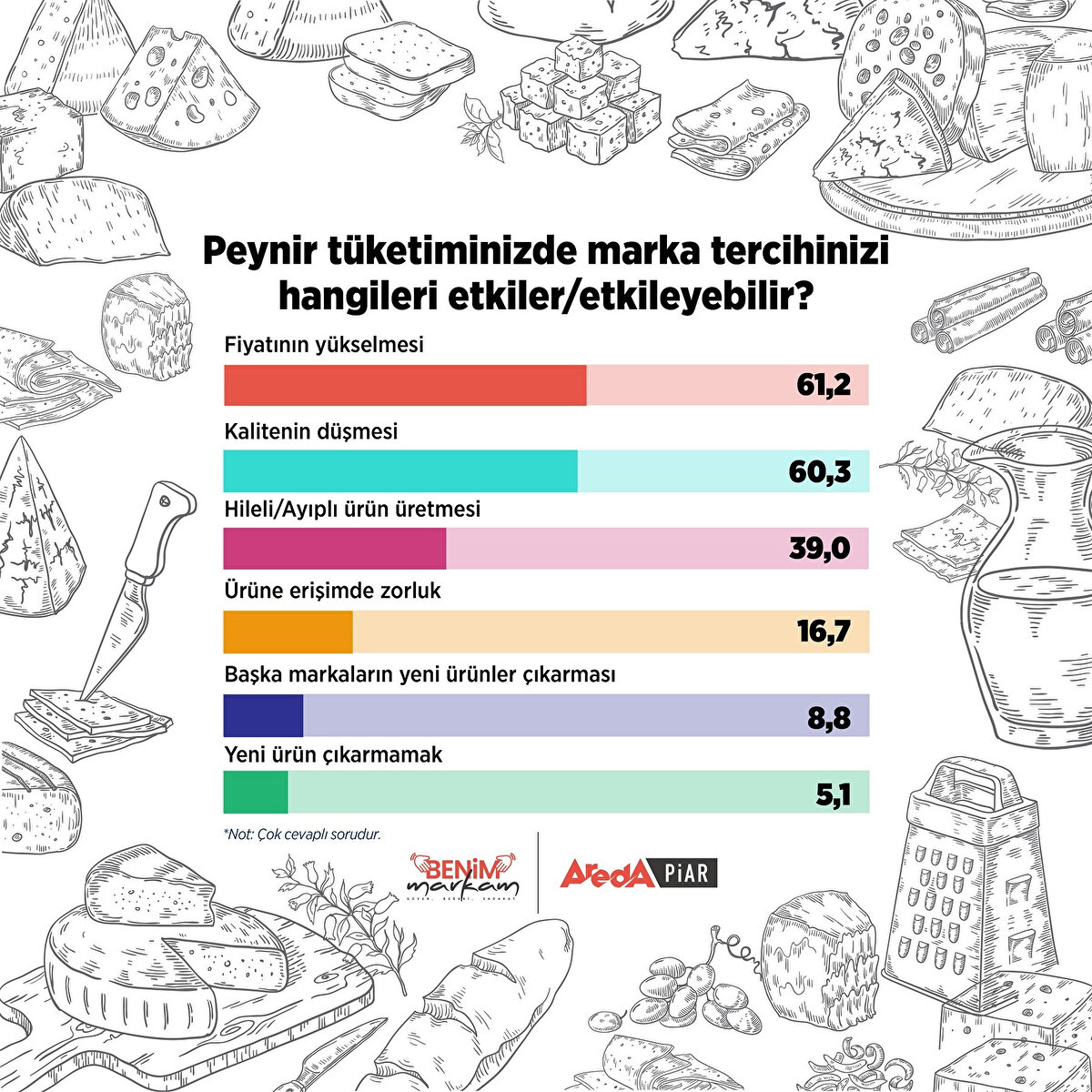 Araştırmada yer alan ‘Peynir tüketiminizdeki marka tercihinizi hangileri etkiler/etkileyebilir?’ sorusuna vatandaşların yüzde 61.2'si fiyatının yükselmesi cevabı verdi. Aynı soruya katılımcıların yüzde 60.3'ü kalitenin düşmesi cevabı verirken diğer yanıtlar şöyle şekillendi: