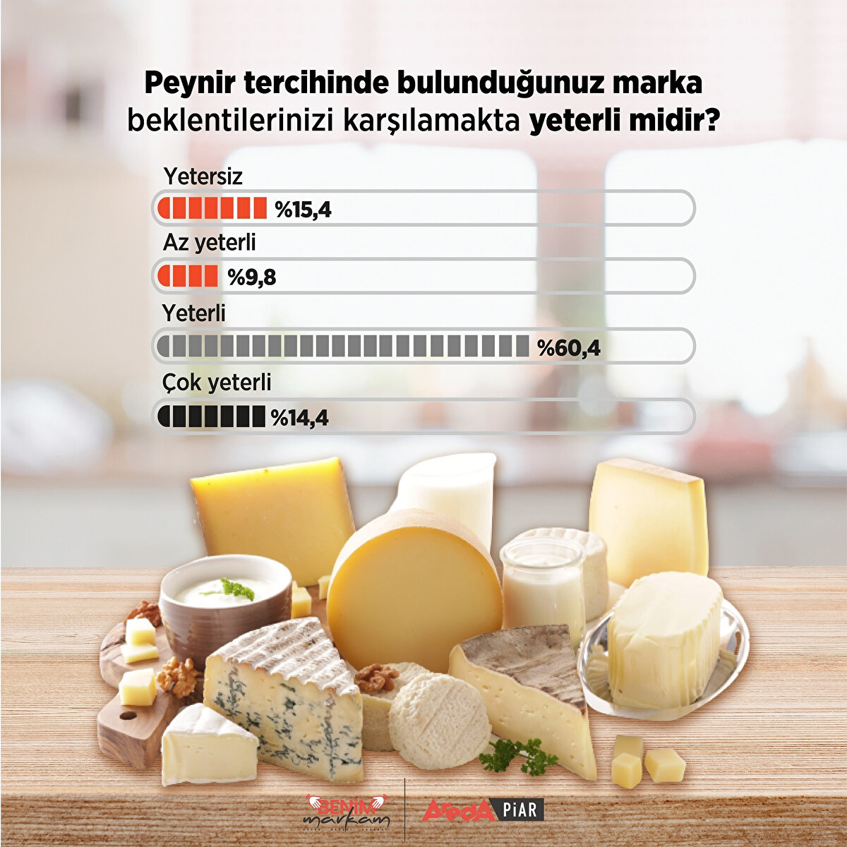 Araştırmada ayrıca, ‘Peynir tercihinde bulunduğunuz marka beklentilerinizi karşılamakta yeterli midir’ şeklinde oldukça kritik bir soru yöneltti. Tüketicilerin markalar hakkındaki görüşlerine ışık tutan soruya, vatandaşların yüzde 60.4'ü yeterli yanıtı verdi. Aynı soruya vatandaşların yüzde 14.4'ü çok yeterli derken, yüzde 9.8'i az yeterli, yüzde 15.4'ü yetersiz cevabı verdi.