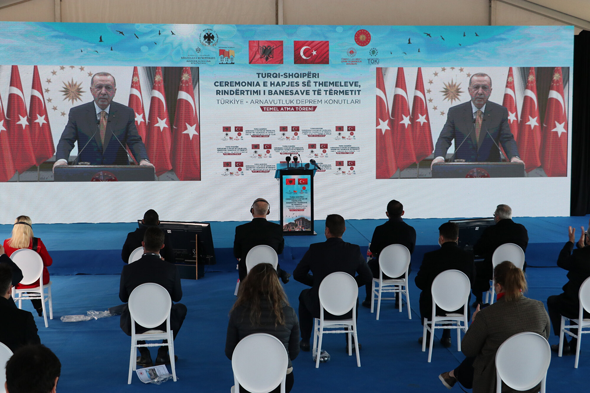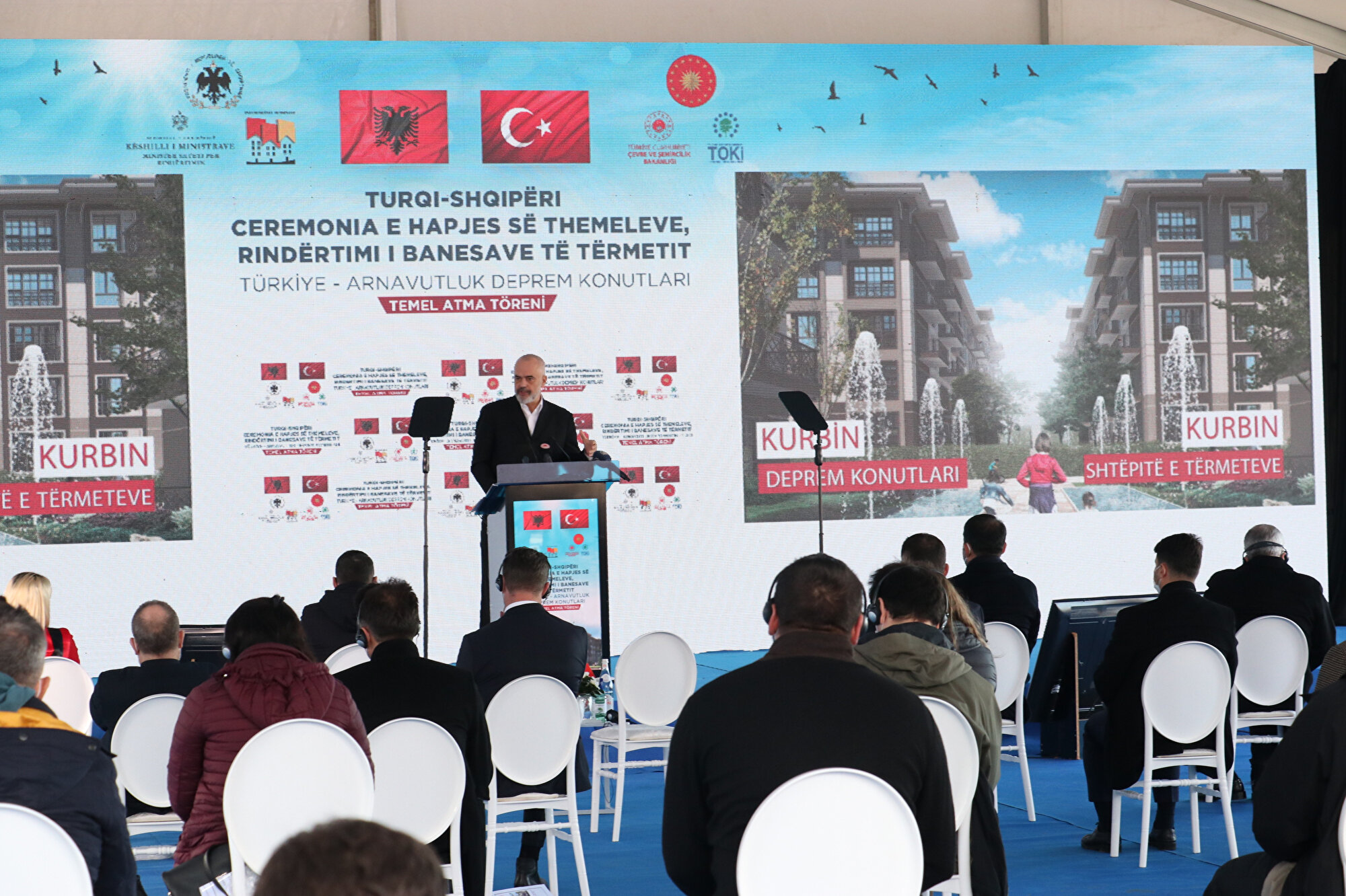 Yaklaşık 2 hafta önce depremzedeler adına yapılmakta olan bu konutların resmî temel töreni düzenlendi ve törende de Arnavutluk Başbakanı Edi Rama ve Türkiye Şehircilik Bakanı Murat Kurumu’nun hazır bulunmasının yanı sıra Türkiye Cumhurbaşkanı Erdoğan da online bağlantı kurarak hem törende katılanlara, hem de tüm Arnavut halkına seslendi.