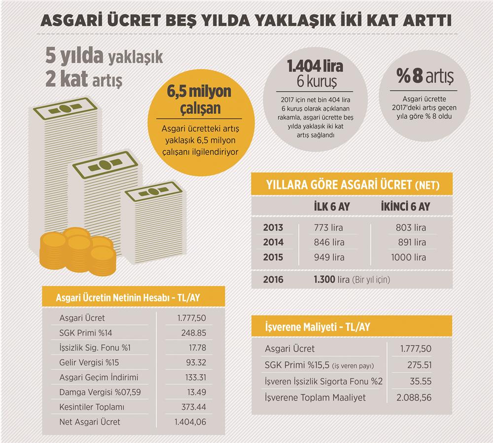 Yeni yılın tamamı için belirlenen rakamlara göre asgari ücret 2017 yılında brüt bin 777 lira 50 kuruş, net bin 404 lira 6 kuruş oldu. Yüzde 8'lik artış oranıyla asgari ücretlinin eline geçen yıla oranla 104 lira fazla geçecek. Evli ve 3 çocuklu bir çalışanın alacağı net rakam ise yaklaşık bin 500 lira. Açıklanan rakamlar 2016 için yapılan yüzde 30'luk artışın çok altında kaldı. Asgari Ücret Tespit Komisyonu üyesi çalışan, işveren ve hükümet temsilcileri masadan mutsuz ayrıldı.