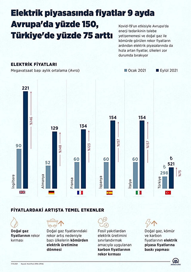 - Türkiye spot elektrik piyasası EPİAŞ'ta ise ocakta ortalama 298 lira olarak belirlenen 1 megavatsaat elektriğin fiyatı eylülde yüzde 75 artışla yaklaşık 521 lira oldu.