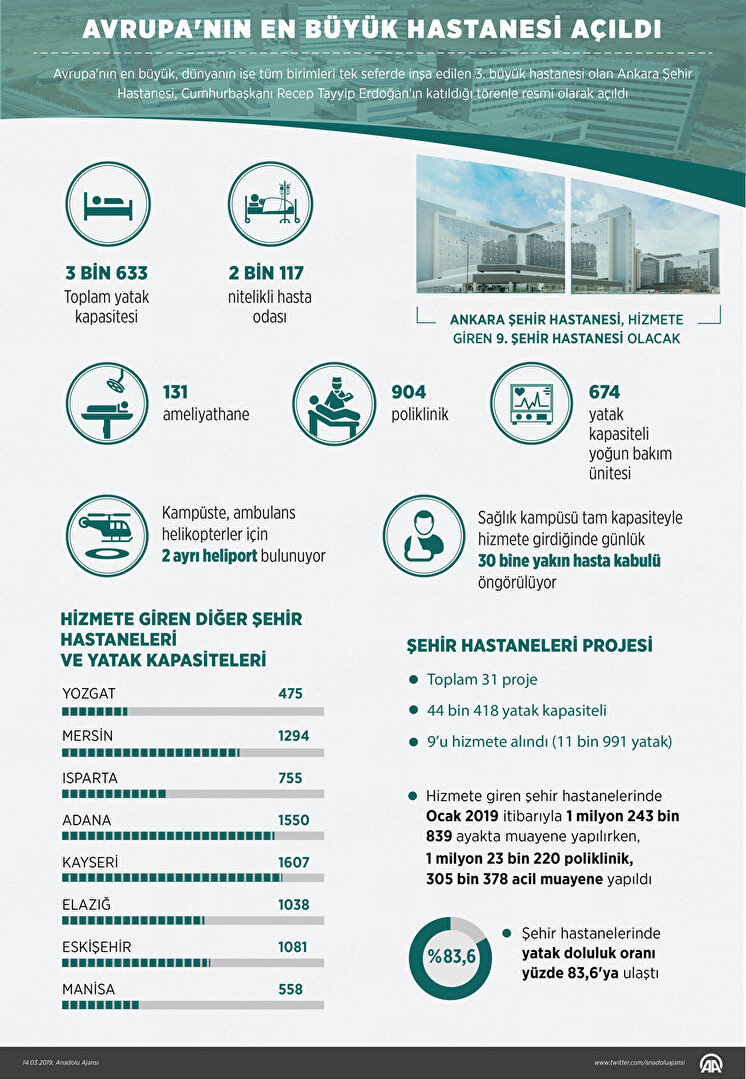 Hizmete giren şehir hastanelerinde bu yıl Ocak ayı itibarıyla, 1 milyon 243 bin 839 ayakta muayene yapılırken, 1 milyon 23 bin 220 poliklinik, 305 bin 378 acil muayene yapıldı. Şehir hastanelerinde yatak doluluk oranı yüzde 83,6'ya ulaştı.
