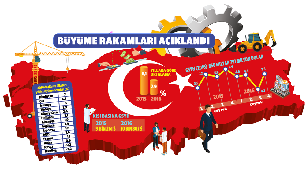 Başta 15 Temmuz olmak üzere birçok terör olayına maruz kalan Türkiye, buna rağmen ekonomik büyümedeki istikrarını bozmadı. 2016'da piyasa beklentilerinin üzerinde GSYH’sini %2,9 artıran Türkiye ekonomisi, AB ve Avro Bölgesi ortalamalarını ikiye katladı. Ekonomistler hükümetin sağladığı teşvik ve tedbirlerle 2017’deki büyümenin çok daha iyi geleceğini belirtiyor.