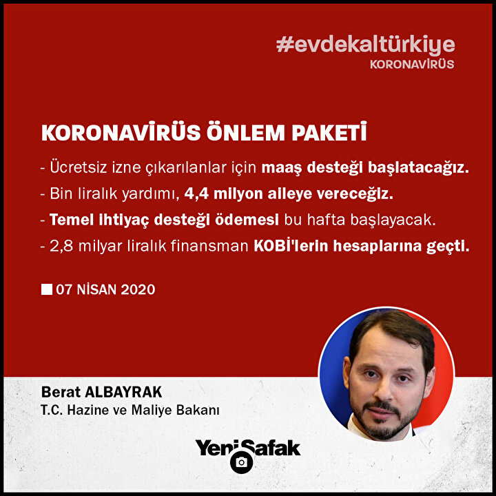 Hazine ve Maliye Bakanı Berat Albayrak: "Dar gelirli 2,1 milyon aileye sağlanan 1000 lira nakdi yardımı yeni 2,3 milyon aileyle birlikte toplamda 4,4 milyon aileye vereceğiz. 5 bin liranın altında geliri olanlara verilecek temel ihtiyaç desteğine 3,7 milyon kişi başvurdu, ödemesi bu hafta başlayacak. Ücretsiz izne çıkarılan vatandaşlarımız merak etmesin, onlar için de maaş desteği başlatacağız. Pazartesi gün sonu itibarıyla yaklaşık 23 bin firmaya kredileri tahsis edildi. 2,8 milyar liralık finansman KOBİ'lerin hesaplarına geçti."