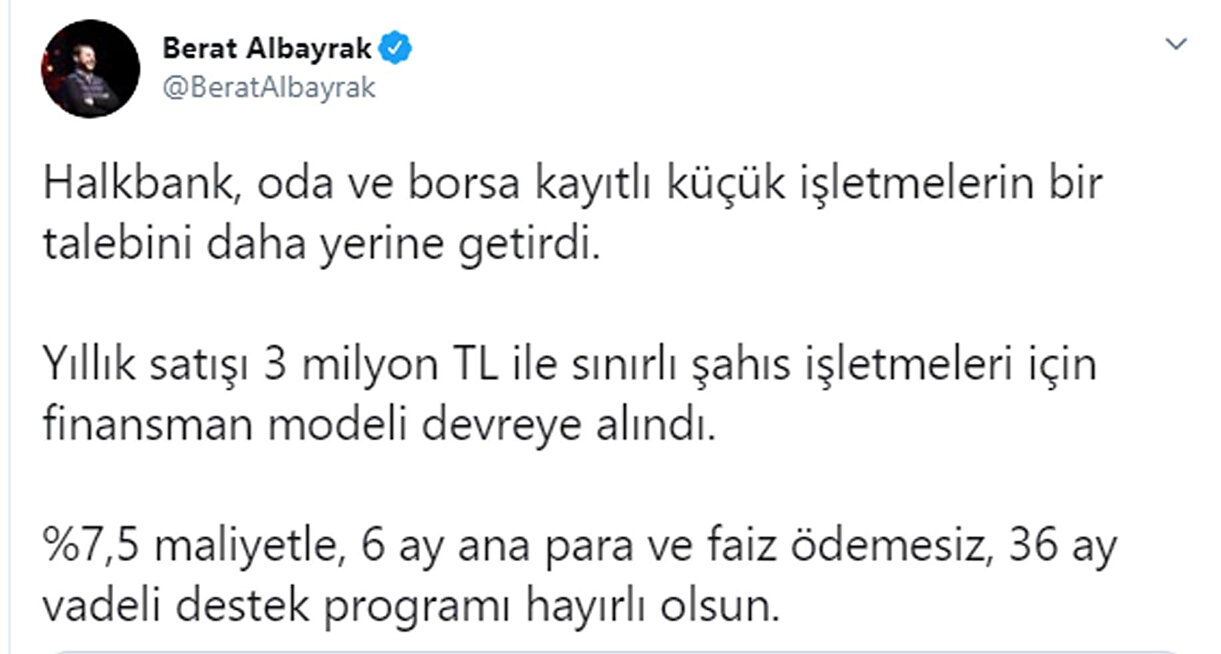 "Halkbank, oda ve borsa kayıtlı küçük işletmelerin bir talebini daha yerine getirdi. Yıllık satışı 3 milyon TL ile sınırlı şahıs işletmeleri için finansman modeli devreye alındı. Yüzde 7,5 maliyetle, 6 ay ana para ve faiz ödemesiz, 36 ay vadeli destek programı hayırlı olsun" ifadelerini kullandı.