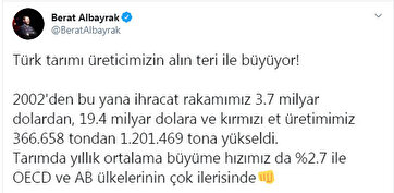 Sosyal medya hesabından açıklamalarda bulunan Hazine ve Maliye Bakanı Berat Albayrak, "Türk tarımı üreticimizin alın teri ile büyüyor! 2002'den bu yana ihracat rakamımız 3.7 milyar dolardan 19.4 milyar dolara ve kırmızı et üretimimiz 366 bin 658 tondan 1 milyon 201 bin 469 tona yükseldi. Tarımda yıllık ortalama büyüme hızımız da yüzde 2.7 ile OECD ve AB ülkelerinin çok ilerisinde" ifadesini kullandı.