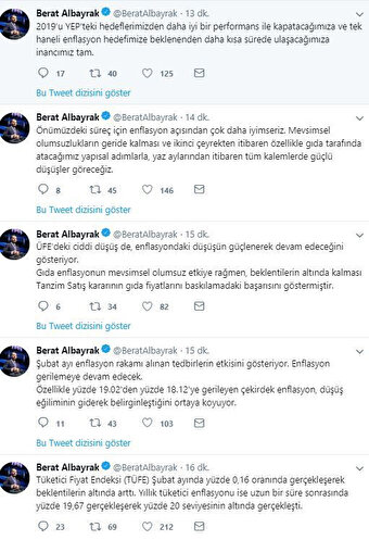 Şubat ayı enflasyon rakamının beklentilerin altında gelmesinin ardından sosyal medya hesabı üzerinden paylaşımlarda bulunan Hazine ve Maliye Bakanı Berat Albayrak, tanzim satış noktalarının gıda fiyatlarını baskıladığını vurgulayarak, ''Şubat ayı enflasyon rakamı alınan tedbirlerin etkisini gösteriyor. Enflasyon gerilemeye devam edecek'' dedi.