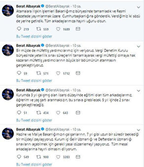 "Vergi Denetim Kurulu bünyesinde yeterlilik sınav süreçlerini tamamlayarak vergi müfettişi olmaya hak kazanan müfettiş yardımcılarının büyük bir bölümünün atamasını gerçekleştiriyoruz. Atamalara ilişkin işlemleri Bakanlığımız bünyesinde tamamladık ve Resmi Gazete'de yayımlanmak üzere Cumhurbaşkanlığına gönderdik. Verdiğimiz iki sözü de yerine getirdik. Tüm arkadaşlarımıza hayırlı uğurlu olsun."