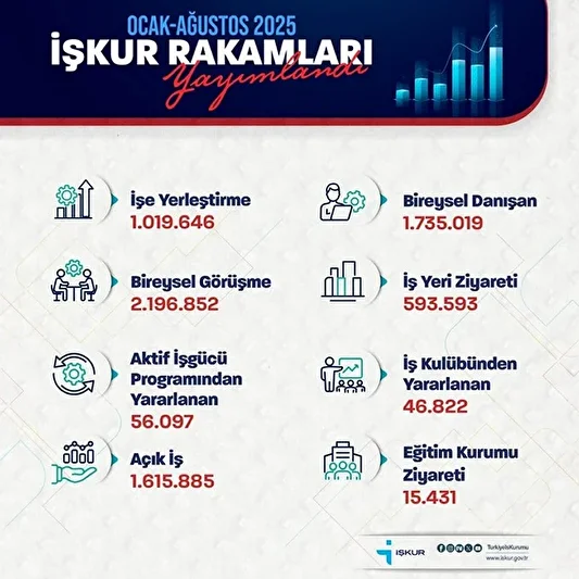 Çalışma ve Sosyal Güvenlik Bakanı Vedat Işıkhan, Türkiye İş Kurumu'nun (İŞKUR) Ocak-Ağustos ayları arasında 1 milyon 19 bin 646 işe yerleştirmeye aracılık ettiğini açıkladı.
