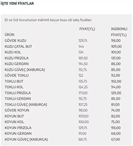 - İndirim sonrası gövde kuzu 129,75 liradan 98 liraya, kuzu pirzola 181,50 liradan 137 liraya, kuzu gerdan 114,50 liradan 86 liraya satılacak.