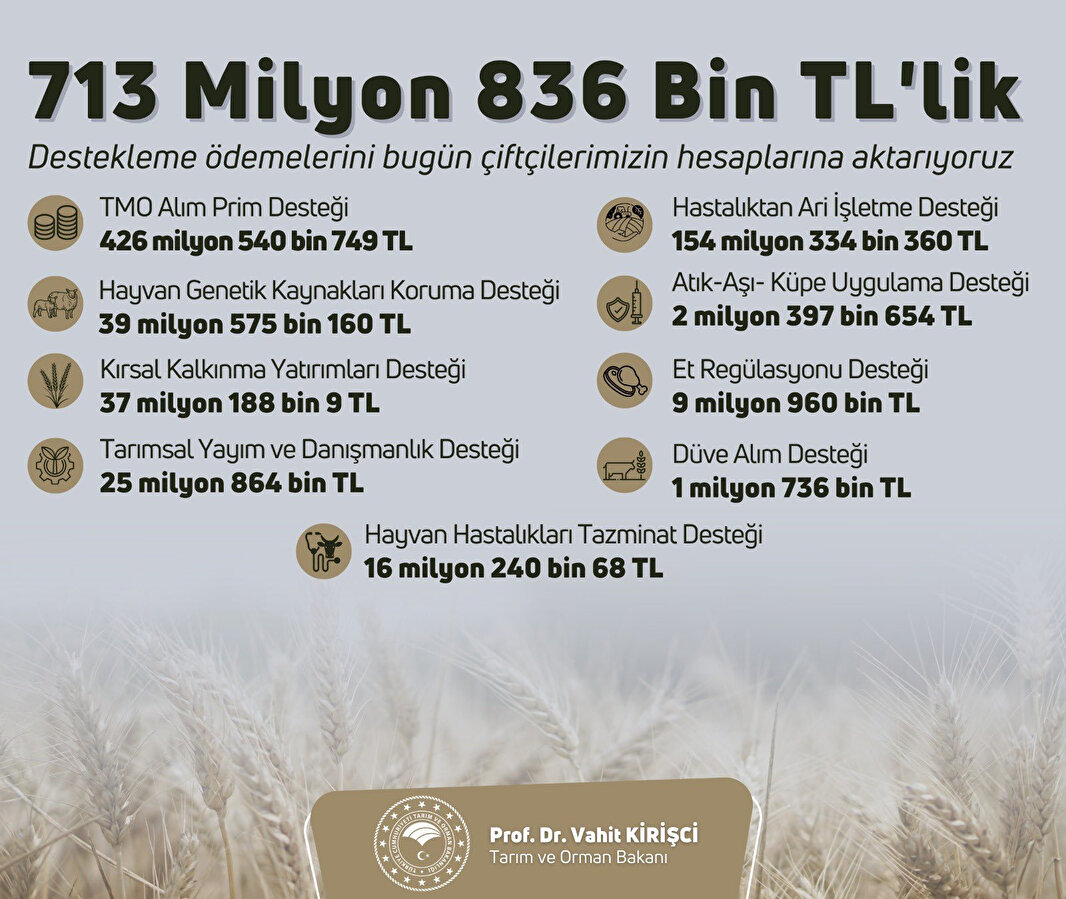 Tarım ve Orman Bakanı Vahit Kirişci, 713 milyon 836 bin liralık tarımsal destek ödemesinin çiftçilerin hesaplarına bugün aktarılacağını bildirdi.