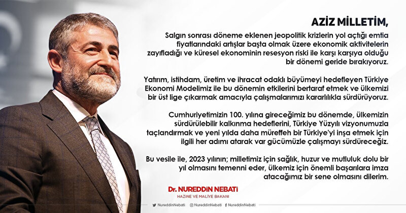 'Türkiye Yüzyılı' hedeflerine değinen Bakan Nebati, "Cumhuriyetimizin 100'üncü yılına gireceğimiz bu dönemde, ülkemizin sürdürülebilir kalkınma hedeflerini, 'Türkiye Yüzyılı' vizyonumuzla taçlandırmak ve yeni yılda daha müreffeh bir Türkiye'yi inşa etmek için ilgili her adımı atarak var gücümüzle çalışmayı sürdüreceğiz. Bu vesile ile 2023 yılının; milletimiz için sağlık, huzur ve mutluluk dolu bir yıl olmasını temenni eder, ülkemiz için önemli başarılara imza atacağımız bir sene olmasını dilerim" diye konuştu.