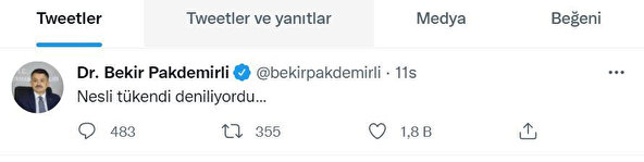 Tarım ve Orman Bakanı Bekir Pakdemirli'nin sosyal medya hesabı üzerinden “Nesli tükendi deniliyordu” şeklindeki paylaşımı merak uyandırdı. Bakan Pakdemirli'nin paylaşımına kısa sürede yüzlerce yorum yağdı.