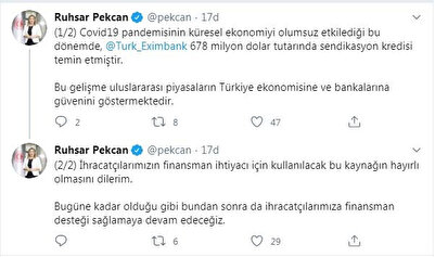 "Covid-19 pandemisinin küresel ekonomiyi olumsuz etkilediği bu dönemde, Türk Eximbank 678 milyon dolar tutarında sendikasyon kredisi temin etmiştir. Bu gelişme uluslararası piyasaların Türkiye ekonomisine ve bankalarına güvenini göstermektedir. İhracatçılarımızın finansman ihtiyacı için kullanılacak bu kaynağın hayırlı olmasını dilerim. Bugüne kadar olduğu gibi bundan sonra da ihracatçılarımıza finansman desteği sağlamaya devam edeceğiz'' dedi.