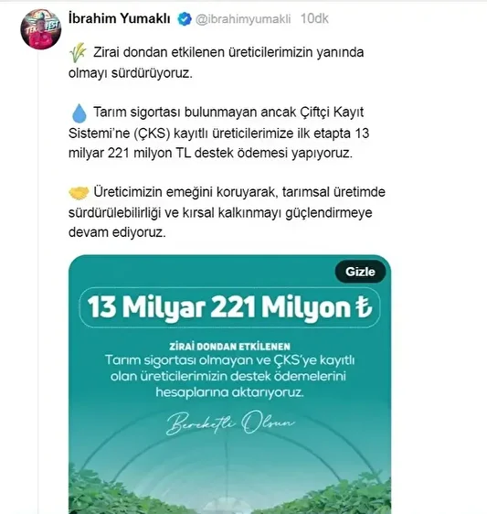 Tarım ve Orman Bakanı İbrahim Yumaklı, "Zirai dondan etkilenen üreticilerimizin yanında olmayı sürdürüyoruz. Tarım sigortası bulunmayan ancak Çiftçi Kayıt Sistemi'ne (ÇKS) kayıtlı üreticilerimize ilk etapta 13 milyar 221 milyon TL destek ödemesi yapıyoruz" dedi.