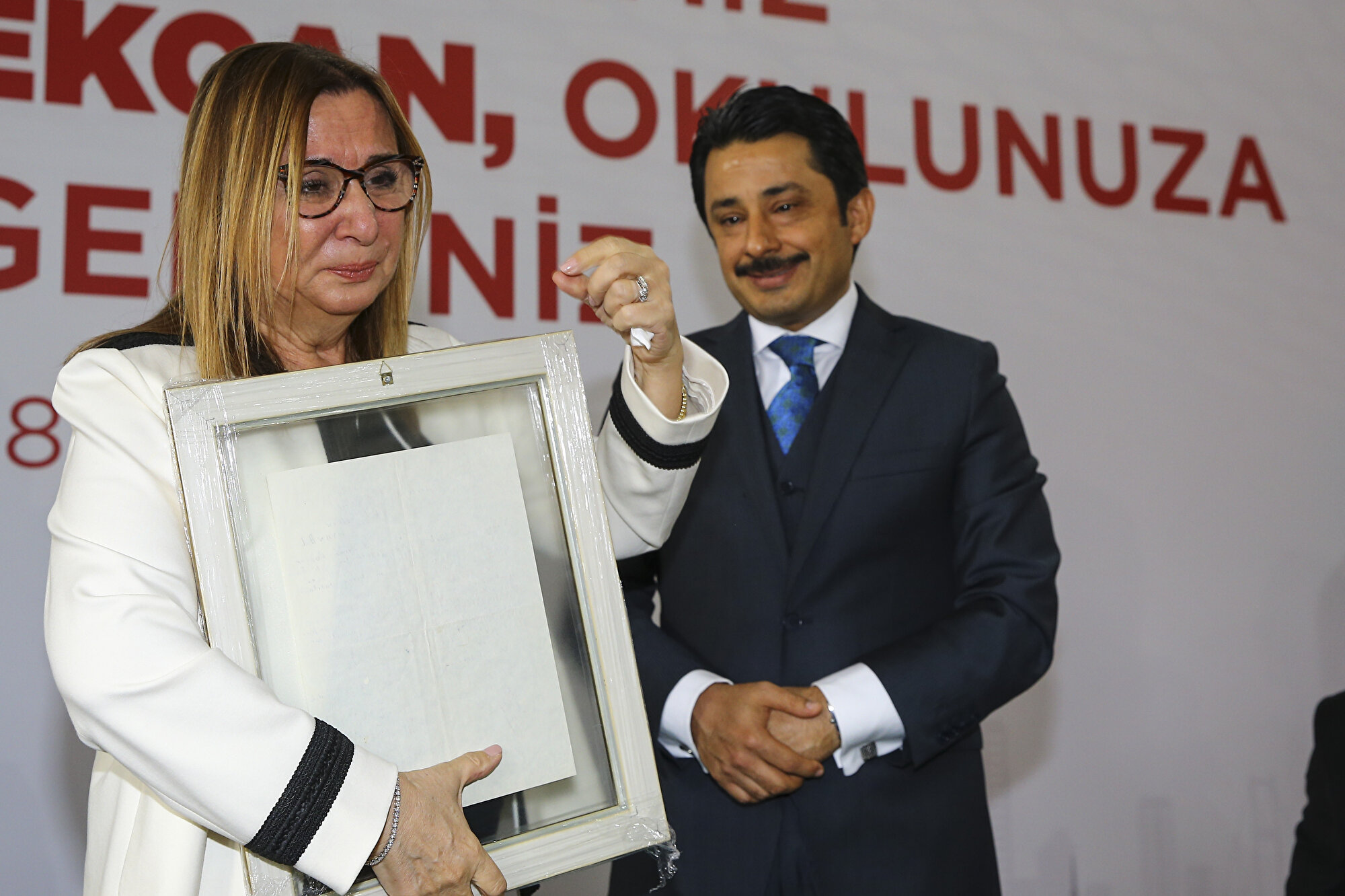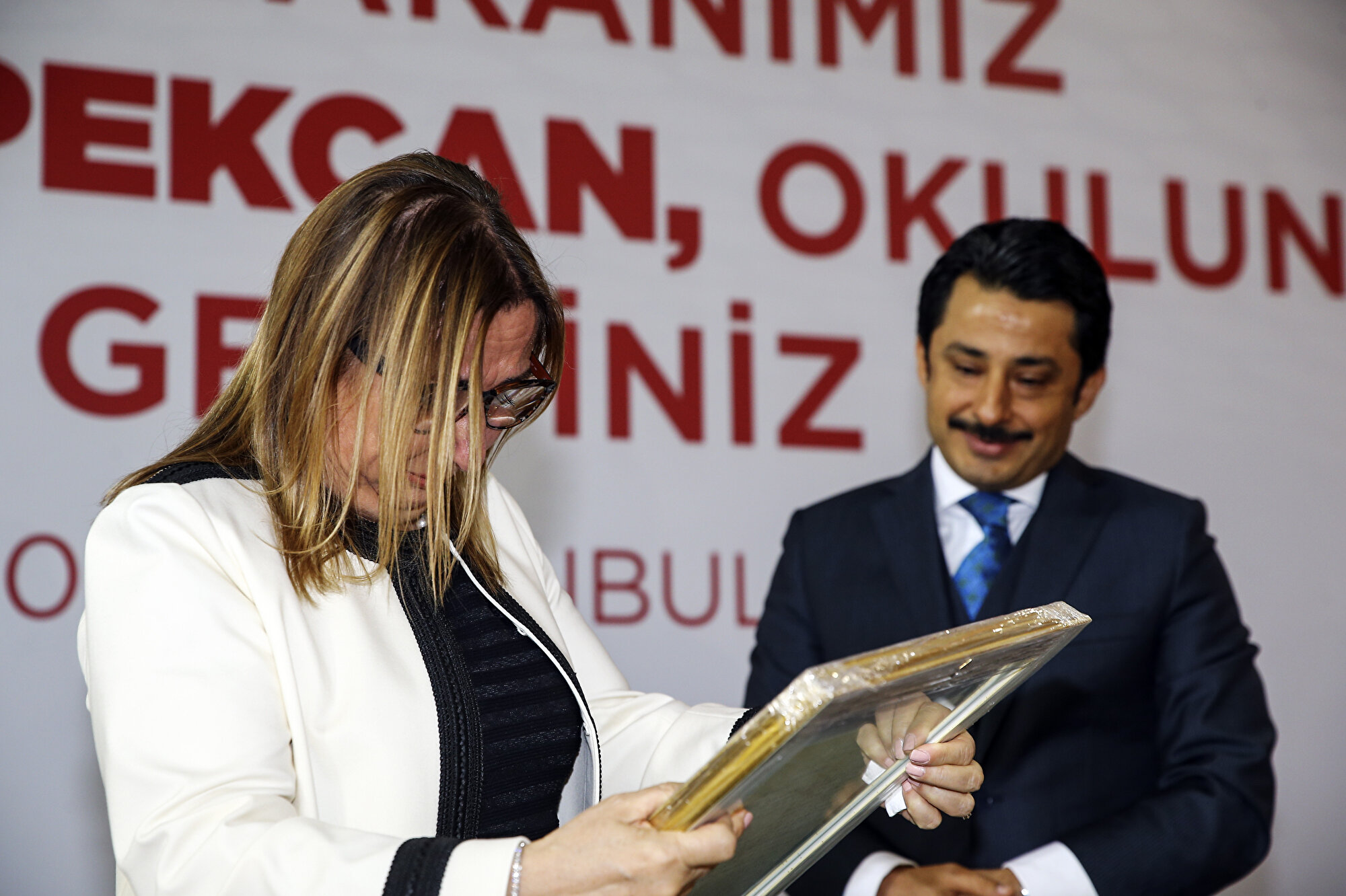 Kendisine ilkokul ve ortaokul diploması, öğrenci dosyasında bulunan o dönemdeki öğretmenler tarafından kaleme alınmış bilginin bulunduğu bir sayfa, başarı belgeleri, öğrenci dosyasından sayfanın takdim edildiği Pekcan, öğrencilik döneminde aldığı başarı belgesine karşılık babası Rıza Kadayıfçı tarafından okula yazılmış bir mektubun okunması ve hediye edilmesi sonrası göz yaşlarını tutamadı.