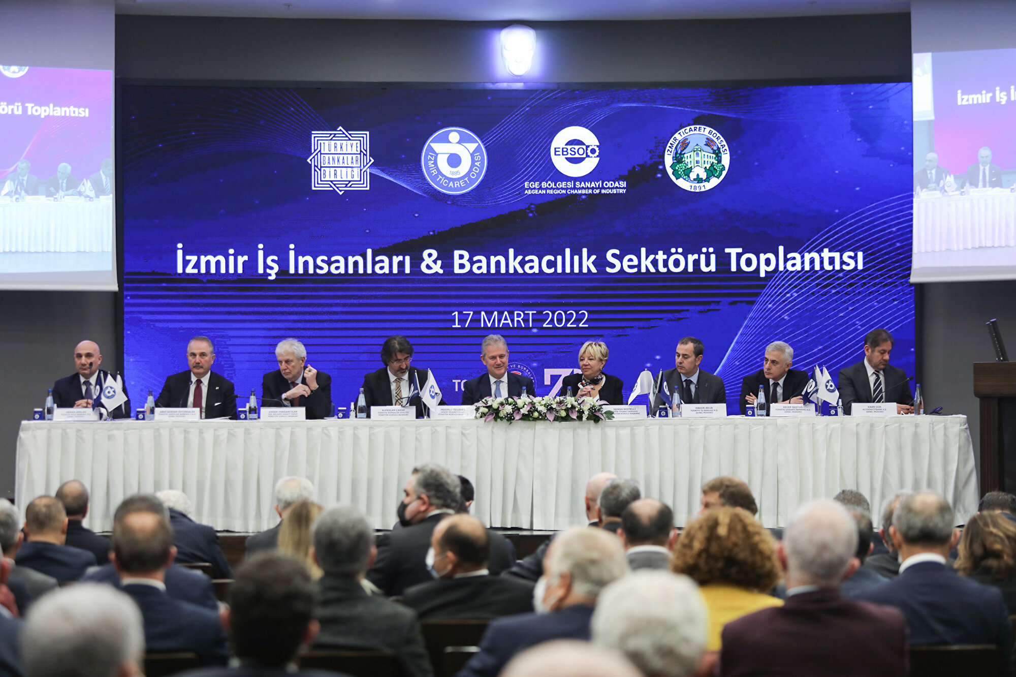 İzmir'de iş dünyası temsilcileri ve banka genel müdürleri, İzmir İş İnsanları ve Bankacılık Sektörü Toplantısı'nda bir araya geldi. İzmir Ticaret Odası Başkanı Özgener, "Finansal kaynaklarımızın etkin ve verimli kullanılması amacıyla hem özel sektör hem de bankacılık sektörü uygun kredi koşullarının sağlanması sorumluluklarını yerine getirmeli" dedi. Ege Bölgesi Sanayi Odası Başkanı Yorgancılar, "Ekonomiye dış kaynak sağlanması konusunda bankalarımızın girişimlerini artırmalarını bekliyoruz" diye konuştu. Türkiye Bankalar Birliği Yönetim Kurulu Başkanı Çakar, "2022 yılında da yüzde 5 civarında büyümeyi sağlıyor olacağız” ifadelerini kullandı. İzmir Ticaret Borsası Yönetim Kurulu Başkanı Kestelli de herkesin tarımın servetini dönüştürme misyonuna, adanmış bir ruh haliyle katkı vermesini istedi.