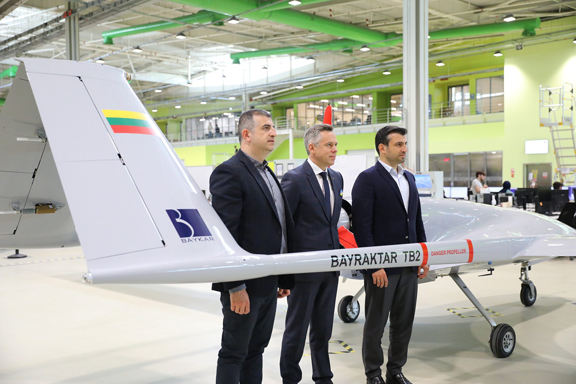 Baykar Teknoloji Lideri Selçuk Bayraktar, Baykar Savunma Genel Müdürü Haluk Bayraktar ve Litvanya Savunma Bakan Yardımcısı Vilius Semeška hediye edilen Bayraktar TB2 önünde birlikte poz verdi.