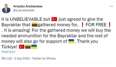 Litvanya Savunma Bakanı Arvydas Anušauskas sosyal medya üzerinden açıklama yaparak “İnanılmaz, Türkiye para toplanan Bayraktar’ı veriyor. ÜCRETSİZ! Bu harika! Toplanan parayla Bayraktar için gerekli mühimmatı alacağız, kalan para ise Ukrayna’ya destek için gönderilecek. Teşekkür ederiz Türkiye!” ifadelerini kullandı.