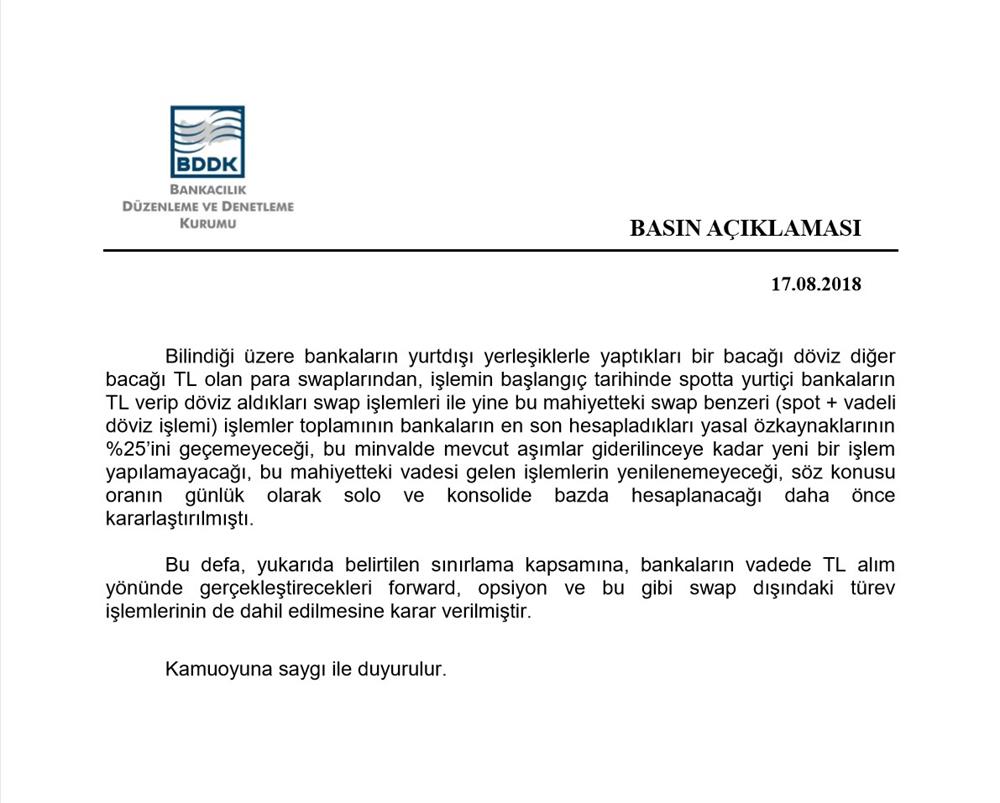 Bu defa, yukarıda belirtilen sınırlama kapsamına, bankaların vadede TL alım yönünde gerçekleştirecekleri forward, opsiyon ve bu gibi swap dışındaki türev işlemlerinin de dahil edilmesine karar verilmiştir.
