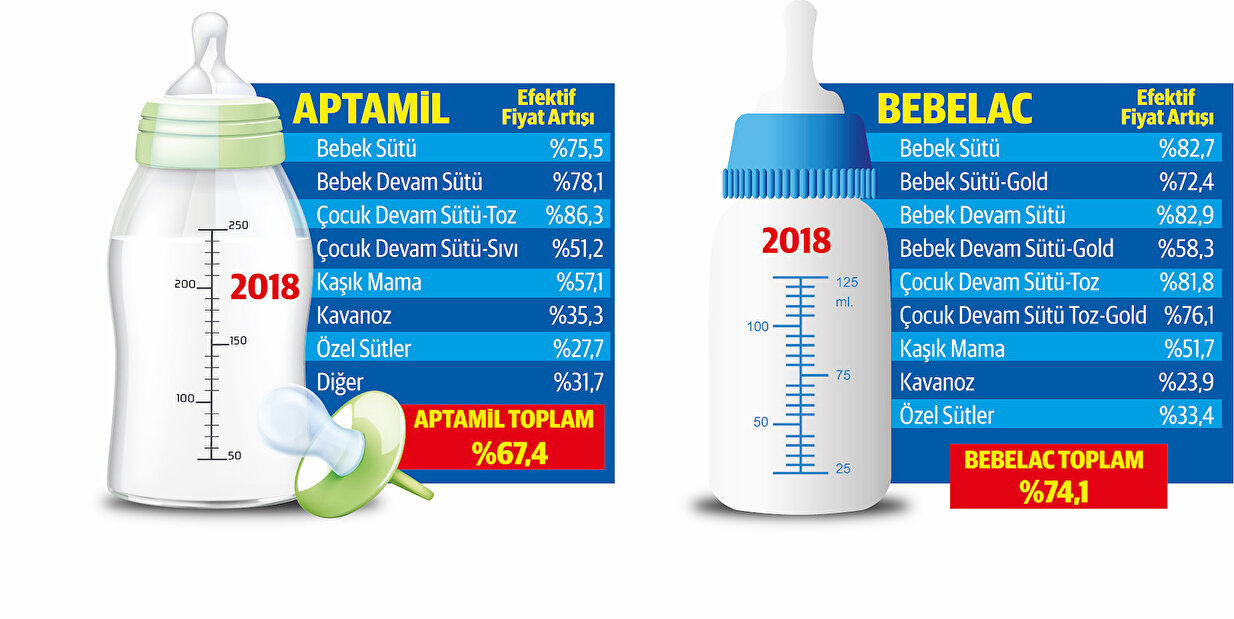 - Geçen yıl Eylül ayındaki zamlar üzerine kamuoyundan yükselen tepkiler üzerine Danone Nutricia çatısı altında bulunan Bebelac ve Aptamil firmalarının Türkiye temsilciliği; satışını yaptıkları ürünlerin yurt dışından avro ile ithal ettiklerini ve fiyatlarının yüzde 90’ının ham ürün maliyetinden oluştuğunu gerekçe göstermişti. 31 Aralık 2017’de 4,52 olan Avro/TL seviyesinin Eylül 2018’de 7,35’e çıktığını ve kurdaki bir yıllık değişimin Eylül 2018 itibariyle yüzde 70,90 olduğunu vurgulayan firma yetkilisi, kurların yükselmesinden dolayı zorunlu olarak zam yaptıklarını ifade etmişti. Firmanın zam gerekçesi kısmın ortadan kaldığı halde, ürün fiyatlarının değişmemişi dikkat çekiyor.