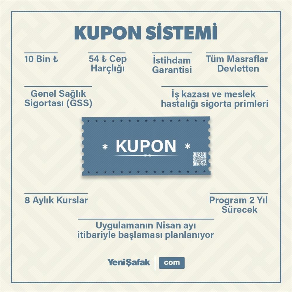 Cumhurbaşkanı Recep Tayyip Erdoğan tarafından ilk defa İstihdam Şurası’nda açıklanan ‘Kupon’ sisteminin detayları beli oldu. Yenisafak.com’un bakanlık kaynaklarından edindiği bilgilere göre
