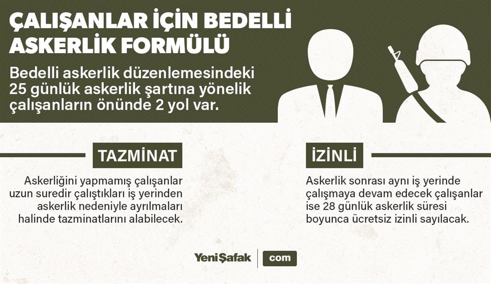 28 günlük askerlik detayı çalışanlar arasında tazminat telaşına da yol açtı. Askerliğini yapmamış çalışanlar uzun suredir çalıştıkları iş yerinden askerlik nedeniyle ayrılmaları halinde tazminatlarının yanıp yanmayacağını merak etmeye basladı. Ancak askerlik gibi zorunlu hallerde işten ayrılmalarda tazminat noktasında hak kaybı yaşanmıyor. Öte yandan yıllık izin ve ücretsiz izin şeklinde söz konusu 25 günlük süreç izinden de sayılabiliyor.