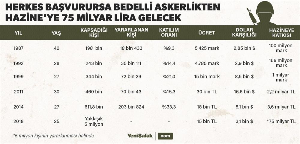 İlk defa 1987 yılında 40 yaş ve üstü için 5 bin 425 Mark ücret ile çıkarılan bedelli askerlikten 18 bin 433 kisi yararlanırken söz konusu düzenleme ile devletin kasasına giren rakam ise 100 milyon Mark olmuş. En son uygulandığı yıl olan 2014’te ise yas 28 bedel ise 18 bin TL olarak belirlenmişti. Söz konusu donemde düzenlemeden yararlananların sayısı 611 bin olmuş devletin kasasına ise 3,6 milyar lira girmişti.