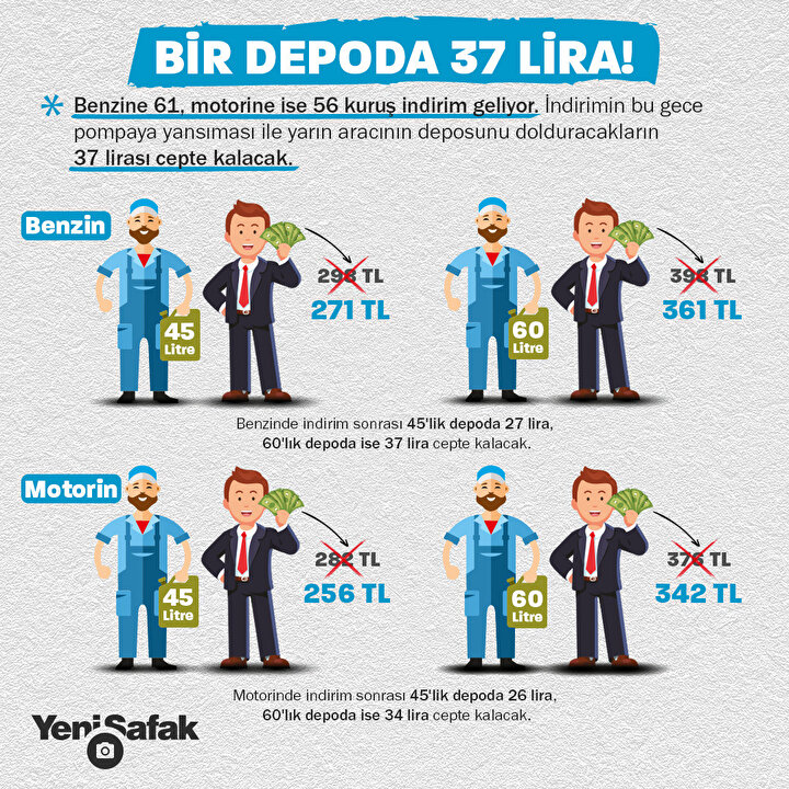 İndirimler göz önünde bulundurulduğunda benzinde indirim sonrası 45'lik depoda 27 lira, 60'lık depoda ise 37 lira, motorinde ise indirim sonrası 45'lik depoda 26 lira, 60'lık depoda ise 34 lira cepte kalacak.