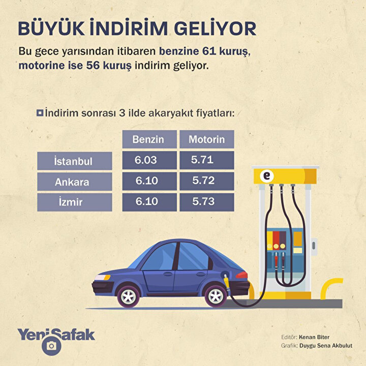 Büyük indirimin bu gece yarısından itibaren pompaya yansımasıyla yarın aracının deposunu dolduracakların ortalama 26 ile 37 lira arasında bir parası cebinde kalmış olacak. İndirim öncesi İstanbul'da 298 TL'den dolan 45 litre depo indirim sonrası 271 TL'ye, 398 TL'ye dolan 60 litrelik depo ise 361 TL'ye inmiş olacak.