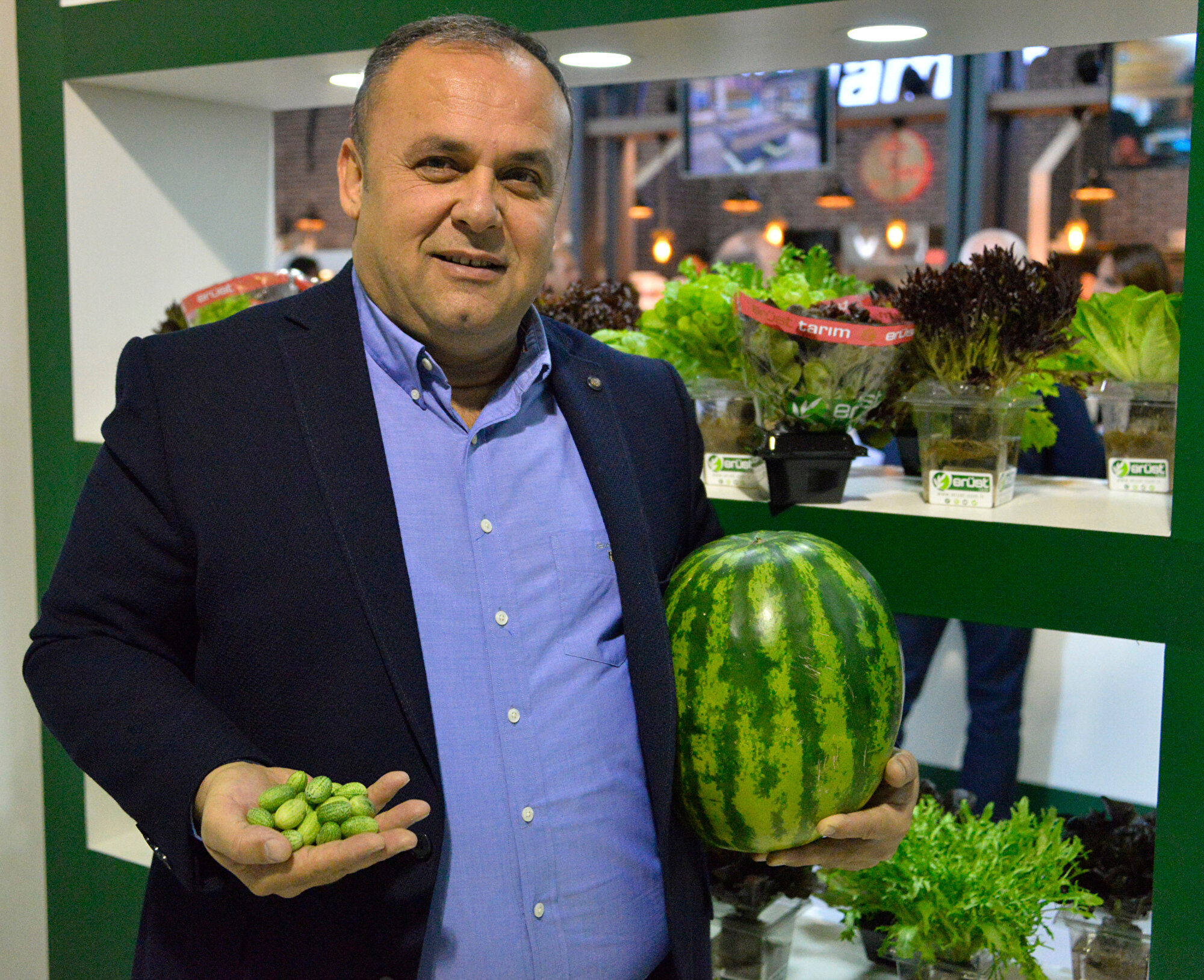 Antalya'da yenilebilir çiçek türleri, mini sebzeler, taze ve saksıda baharatlar, mikro filizler gibi özel ürünlerin üretimini yapan Erüst Tarım firmasının, mini sebzeler kategorisinde minyatür karpuz ürünü, ilk defa 26'ncı Gıda ve İçecek Food Product Fuarı'nda tanıtıldı.
