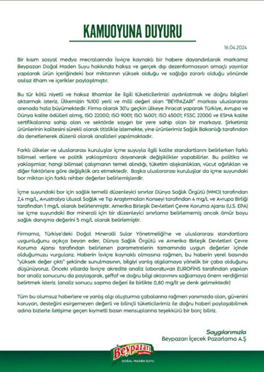 Doğal maden suyu alanında faaliyet gösteren Beypazarı İçecek Pazarlama A.Ş, ürünlerindeki bor miktarının yüksek düzeyde ve sağlığa zararlı olduğu iddialarına ilişkin açıklama yaptı. "Yönetmeliğe ve uluslararası standartlara uygunuz" denilen açıklamada, "Şirketimiz, ürünlerinin kalitesini sürekli olarak titizlikle izlemekte, yine ürünlerimiz Sağlık Bakanlığı tarafından da denetlenerek düzenli olarak analizleri yapılmaktadır." ifadeleri yer aldı. Açıklamada, Dünya Sağlık Örgütü ve Çevre Koruma Ajansı verilerine de yer verildi.