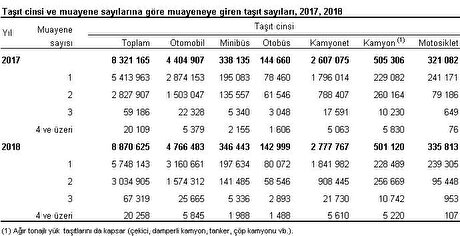 - Türkiye'de 2018 yılında 8 milyon 870 bin 625 taşıt muayeneye tabi tutuldu. Taşıtların yüzde 64.8'i muayeneye bir kez girerken. yüzde 34.2'si iki. yüzde 0.8'i üç ve yüzde 0.2'si ise dört ve üzeri sayıda muayeneye tabi tutuldu.