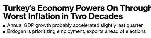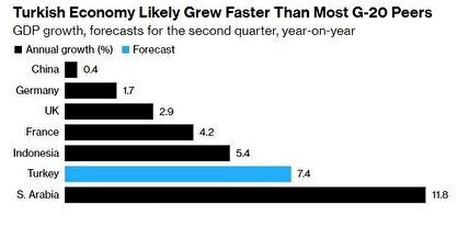 Türkiye'de artan enflasyona rağmen büyüyen bir ekonominin olması dünyanın dikkatinden kaçmıyor. The Economist'in değerlendirmesinden sonra dikkat çeken başka bir analiz de ABD merkezli medya kuruluşu Bloomberg'den geldi. Türk ekonomisinin ne olursa olsun rayından çıkmadığını söyleyen Bloomberg, Erdoğan'ın 'ihracat, üretim, istihdam' mesajını hatırlatarak Türkiye'nin G20 ülkelerinin büyüme hızını geçmiş olabileceğini ifade etti.